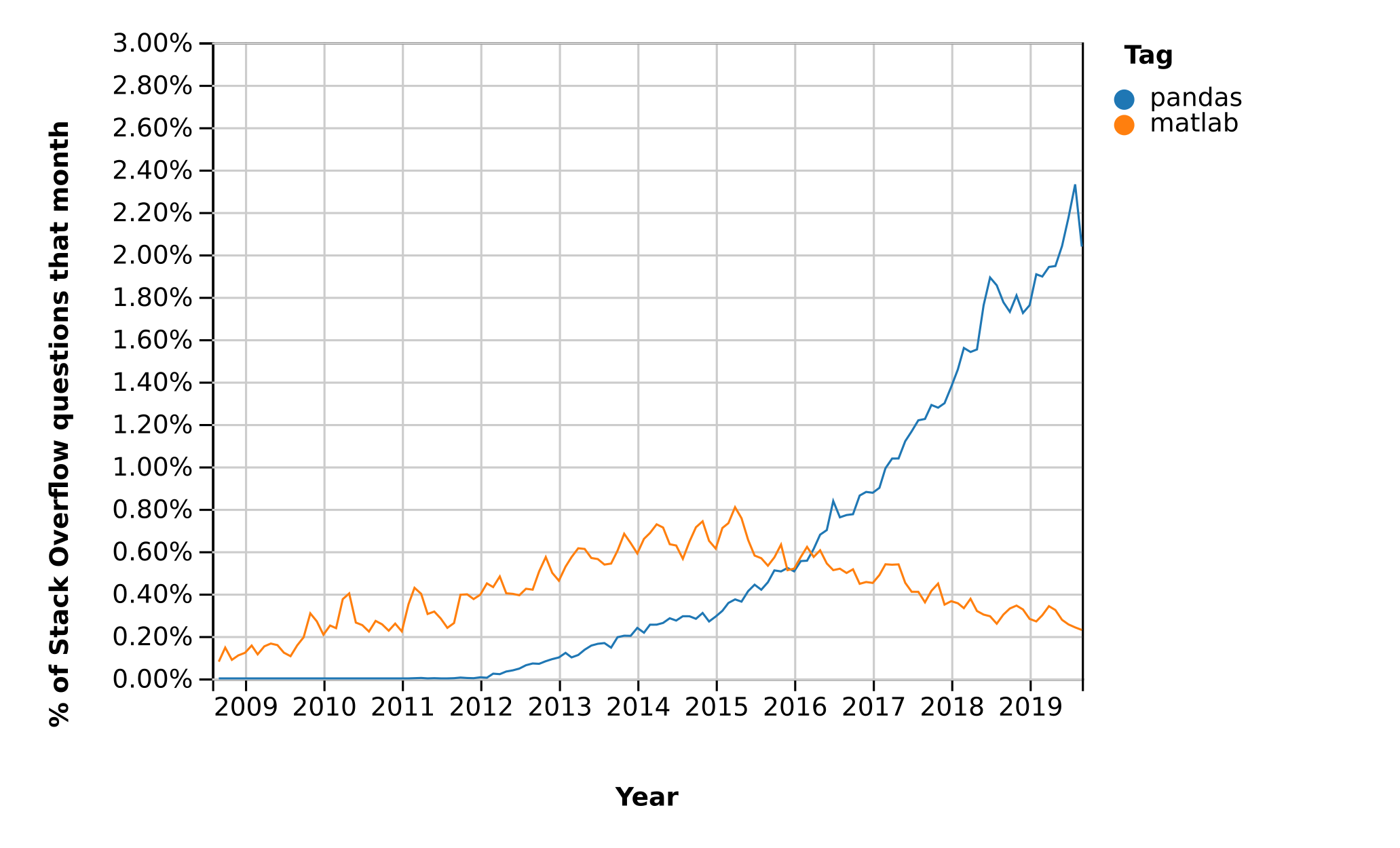 For example, the popularity of pandas, a library for data analysis with Python has exploded, as seen here.